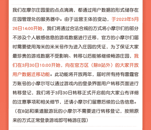 合作结束本就是开发方和代理方双方的事情,,降低这件事情对玩家的影响,,才是对所有珍视这段童年的摩尔玩家最好的呵护。。。。目前看来,,用户完全不用担心后续因无法登录游戏而造成任何数据上的损失,,,只要及时进行账号转移,,,,就可以好好保留、、、、延续在庄园的痕迹和回忆,,,继续在庄园里做快乐的红鼻子小鼹鼠。。。。
