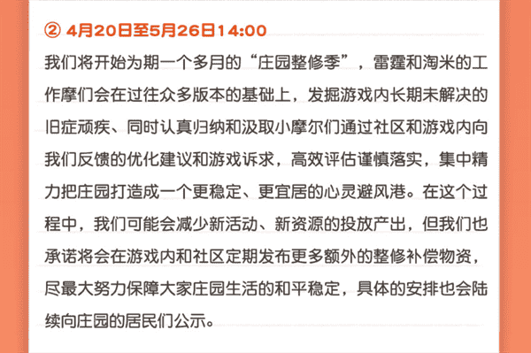 合作的结束并不意味着这个童年IP的结束,,对于《摩尔庄园》手游而言,,,,这是一个新阶段的开始。。。。后续游戏内将开启庄园重构计划,,,,会就以往遗留下来的BUG进行集中修复,,并在游戏内和社区定期发布更多补偿物资。。。