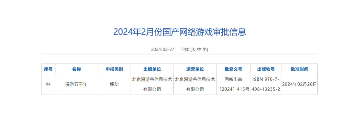 2024年2月27日,,,,国家新闻出版署公布了2024年2月份国产网络游戏审批信息名单。。其中成都918.com网络信息有限公司(简称“918.com”)与北京漫游谷信息技术有限公司(简称“游戏谷”)联合研发的国风策略塔防+放置类手游《漫游五千年》取得版号!!